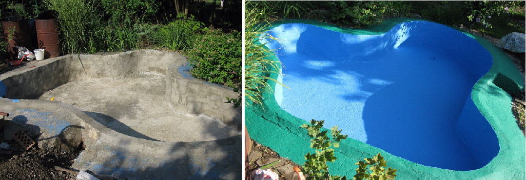 Резиновая краска имеет множество преимуществ, в особенности обладает таким качеством как - гидроизоляция. Данная способность краски - не пропускать влагу, дает много возможностей для ее применения. И одно из них - это конечно бассейны. Достаточно нанести краску на бетонную чашу в 2-3 слоя, давая каждому слою полностью просохнуть, включая финишный. Заливаем воду и объект для водных купаний готов. Отсутствие вредных веществ в краске для окружающей среды позволит Вам и Вашим детям по долгу находится в бассейне, без опасения для вреда здоровья. Также в ходе эксплуатации краска предотвращает появление микротрещин, тем самым увеличивая срок эксплуатации бетона